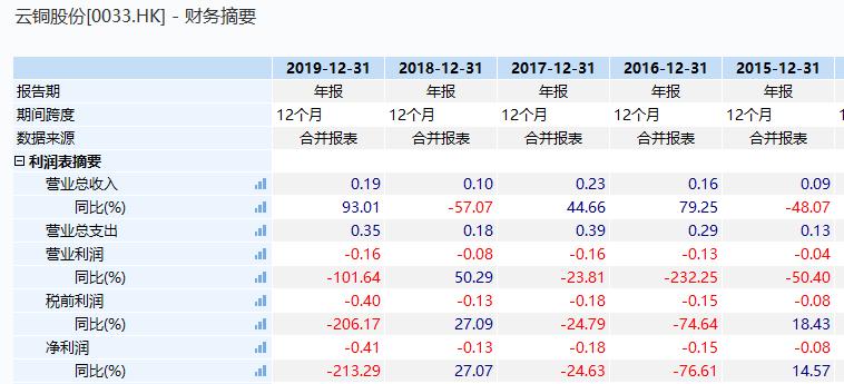 从公司基本面来看,很难想象这样一家公司居然有动辄几百亿买商标的实力。毕竟,过去5年时间,云铜股份营收合计仅为0.78亿元,净利润则连亏五年,亏损近亿元。尤其在2019年,这家公司的营业利润同比负增101%,净利润同比负增213%。